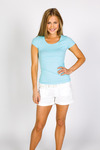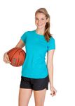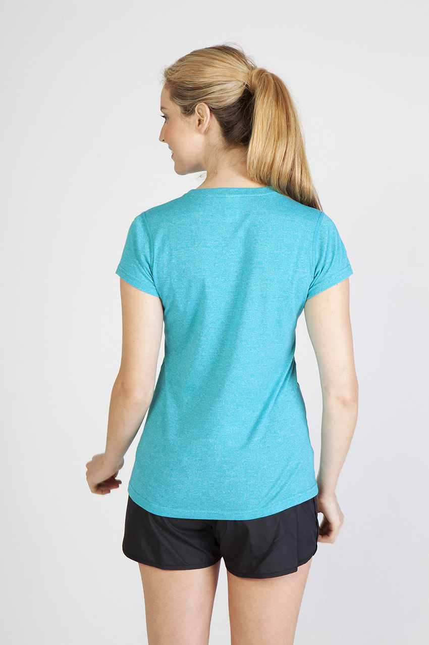 Neck ribbing, crew neck, side seamed, shoulder to shoulder tape, double needle hems, moisture wicking, quick drying